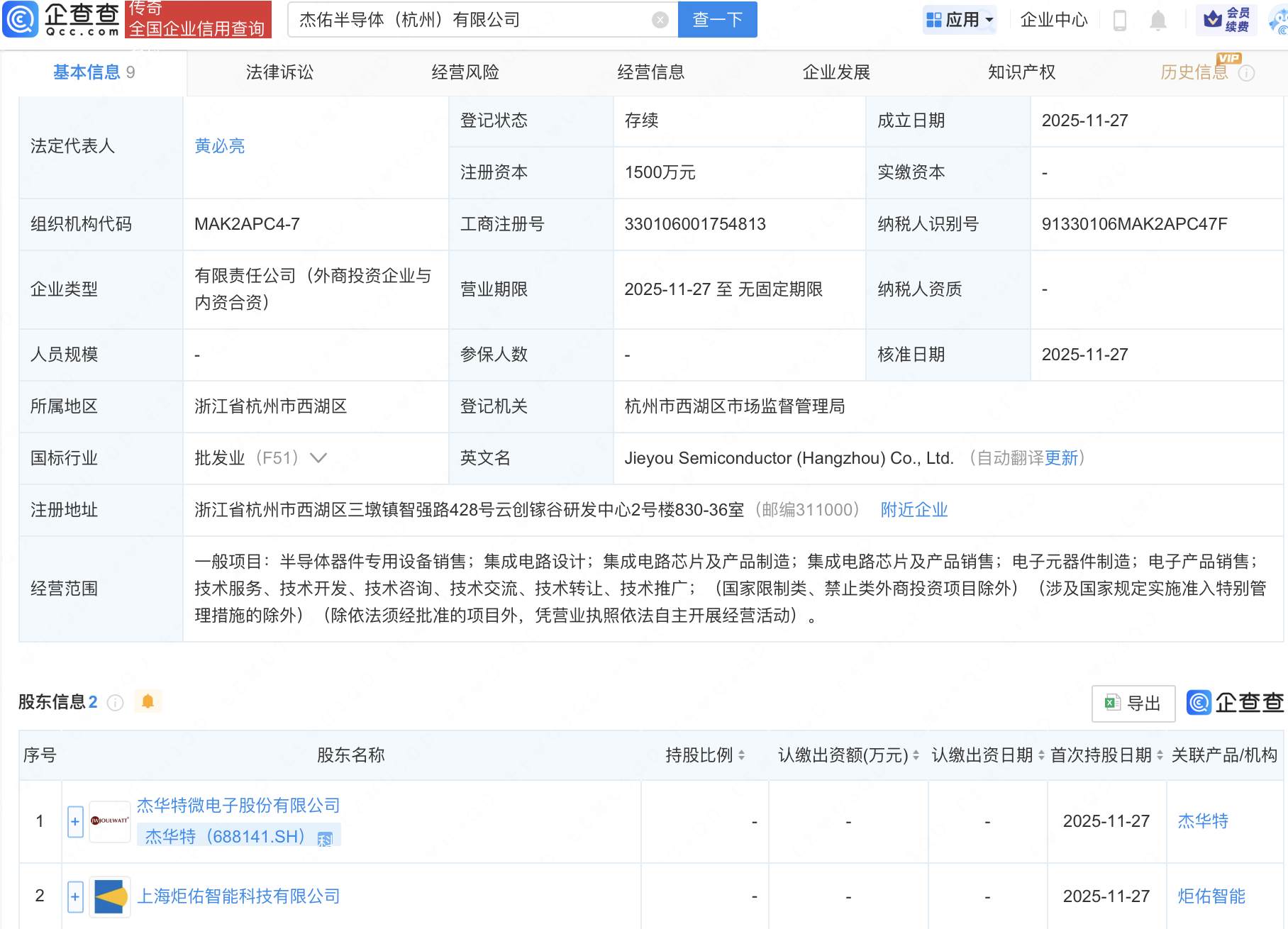 近日,杰佑半导体(杭州)有限公司成立,注册资本1500万元炒股配资门户网站,经营范围包含:半导体器件专用设备销售;集成电路设计;集成电路芯片及产品制造;集成电路芯片及产品销售等。企查查股权穿透显示,该公司由杰华特(688141)等共同持股。