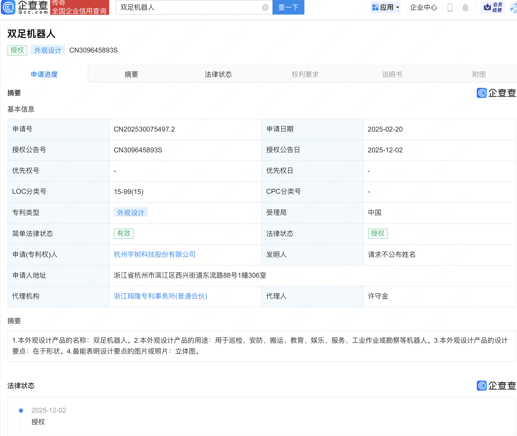 近日,杭州宇树科技股份有限公司“双足机器人”专利获授权。企查查专利摘要显示股票配资越大配资,本外观设计产品用途用于巡检、安防、搬运、教育、娱乐、服务、工业作业或勘察等机器人,其设计要点在于形状。